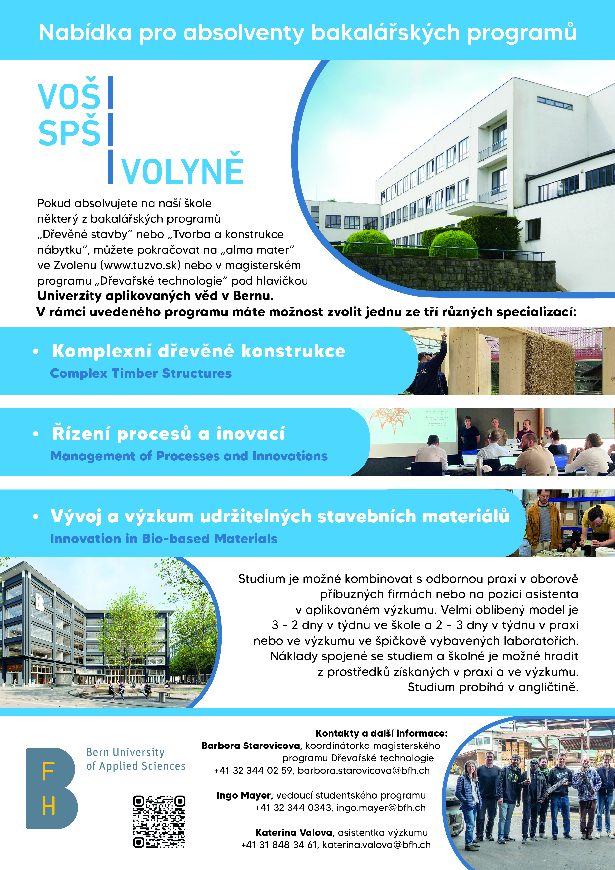 Pokud absolvujete na naší škole některý z bakalářských programů „Dřevěné stavby“ nebo „Tvorba a konstrukce nábytku“, můžete pokračovat v magisterském programu „Dřevařské technologie“ pod hlavičkou Univerzity aplikovaných věd v Bernu.